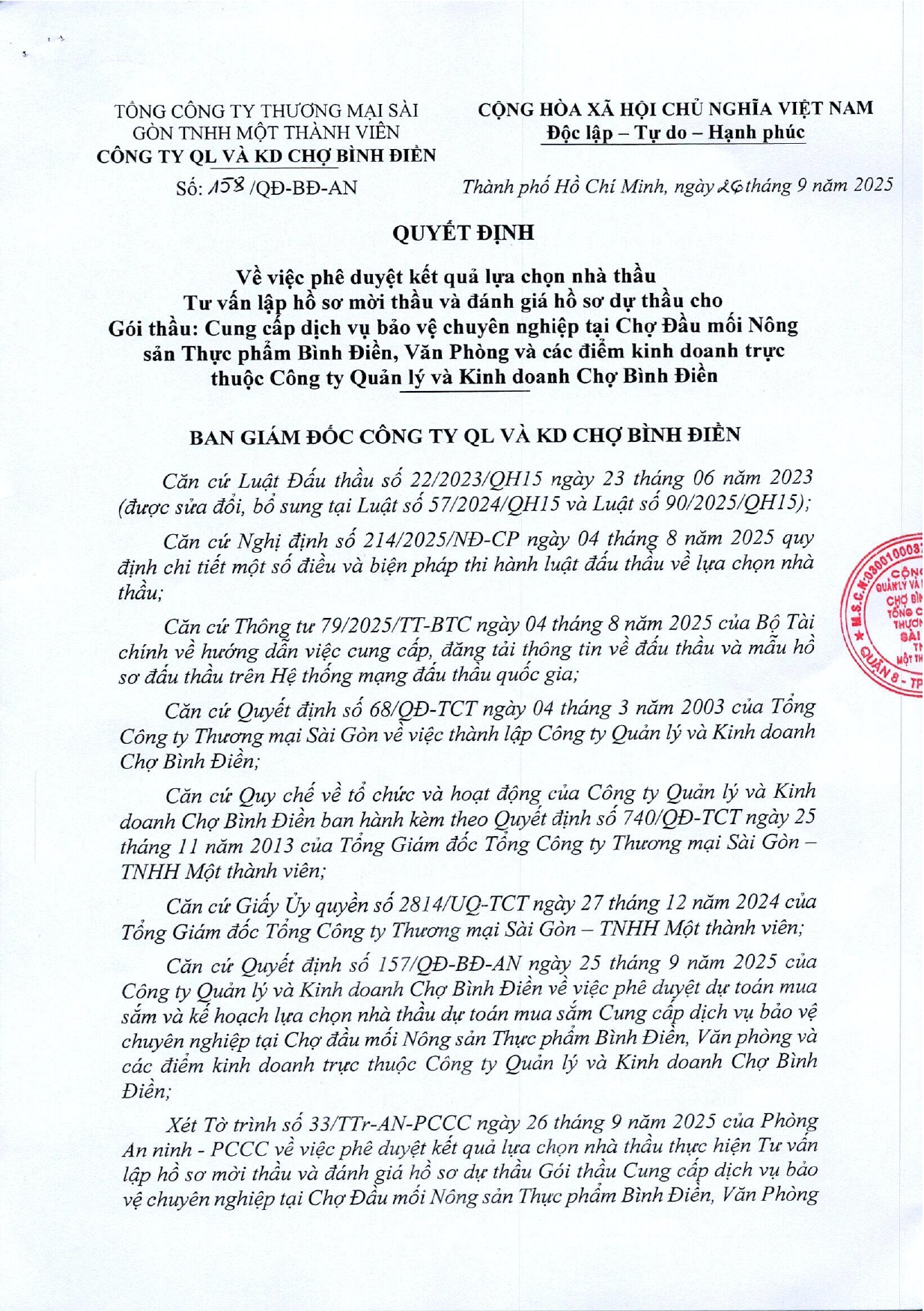 QUYẾT ĐỊNH 158 PHÊ DUYỆT KQCDT TƯ VẤN LẬP HSMT