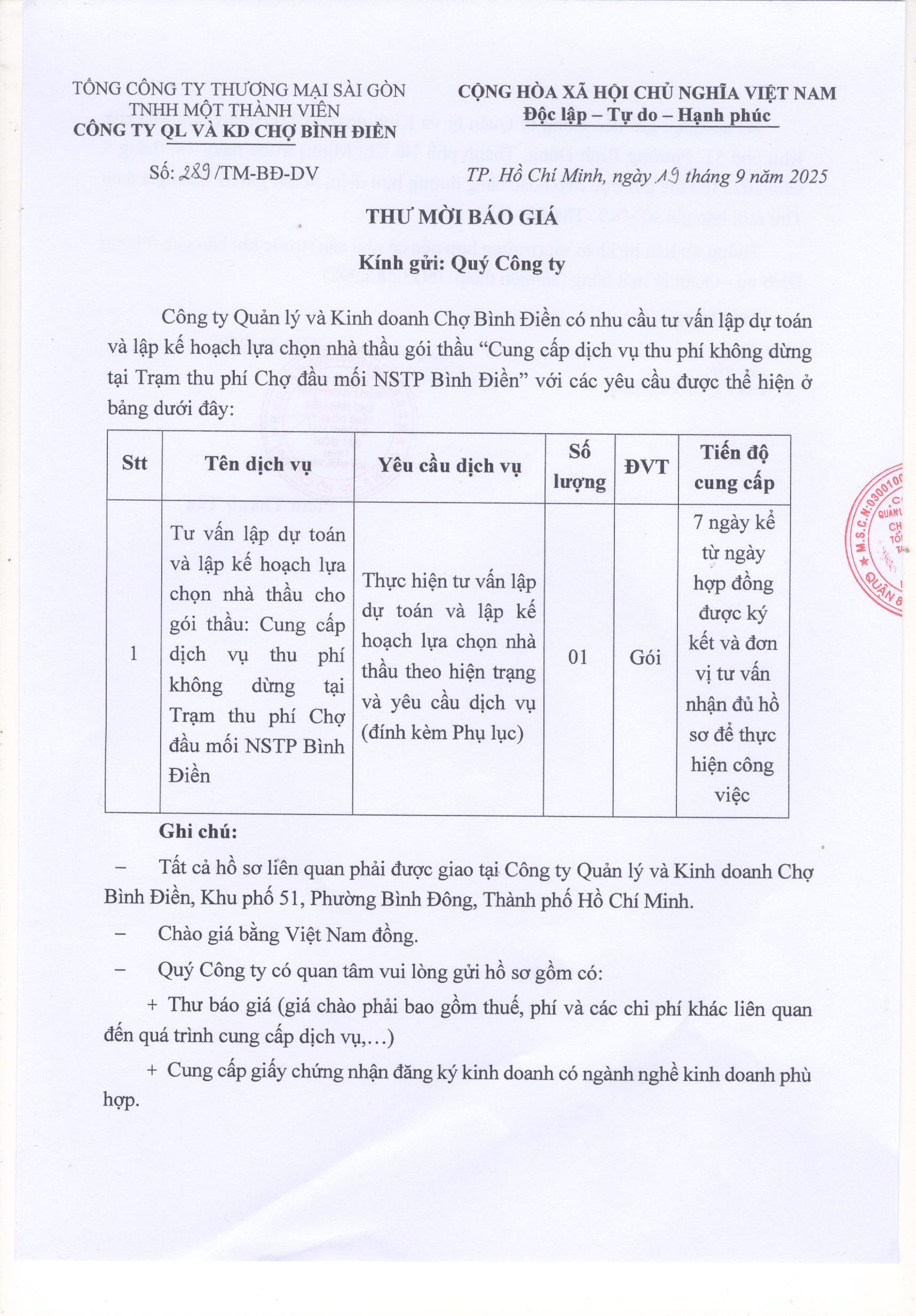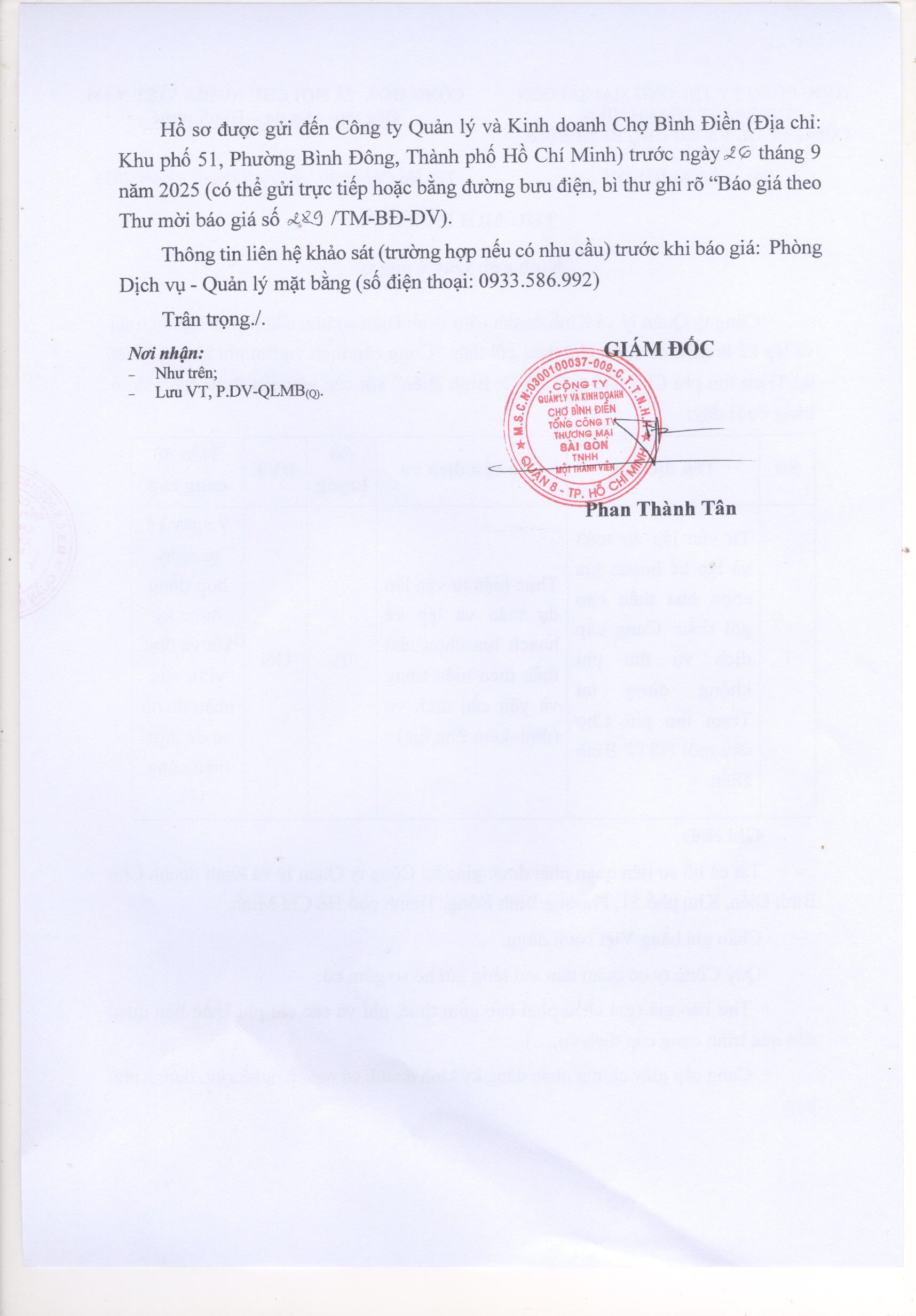 THƯ MỜI BÁO GIÁ Về việc báo giá dịch vụ Cung cấp đan thoát nước gang cầu cho nhà lồng D tại Chợ Đầu mối Nông sản Thực phẩm Bình Điền