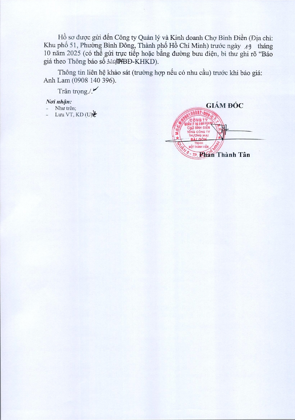 THƯ MỜI BÁO GIÁ Về việc báo giá dịch vụ Cung cấp đan thoát nước gang cầu cho nhà lồng D tại Chợ Đầu mối Nông sản Thực phẩm Bình Điền