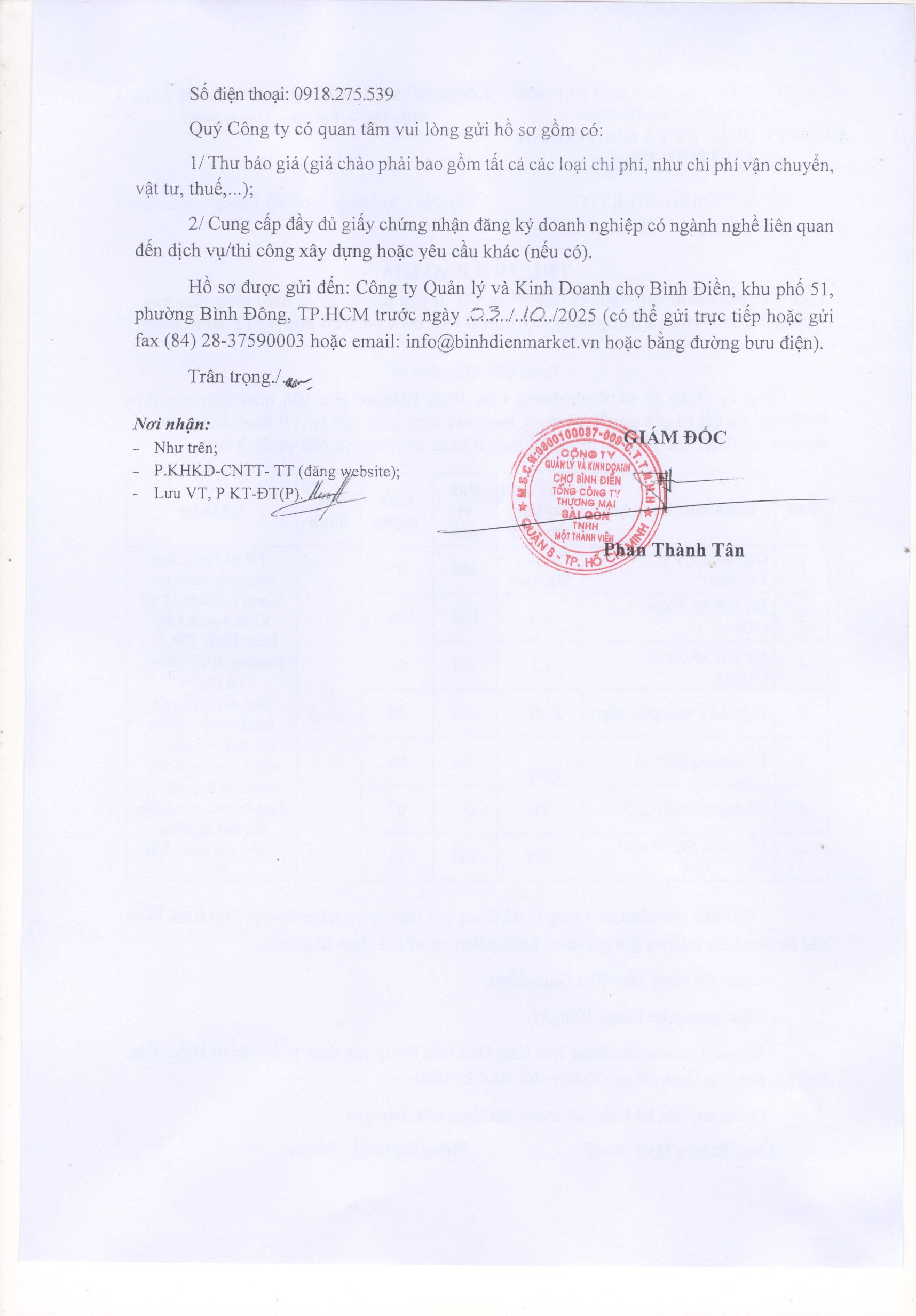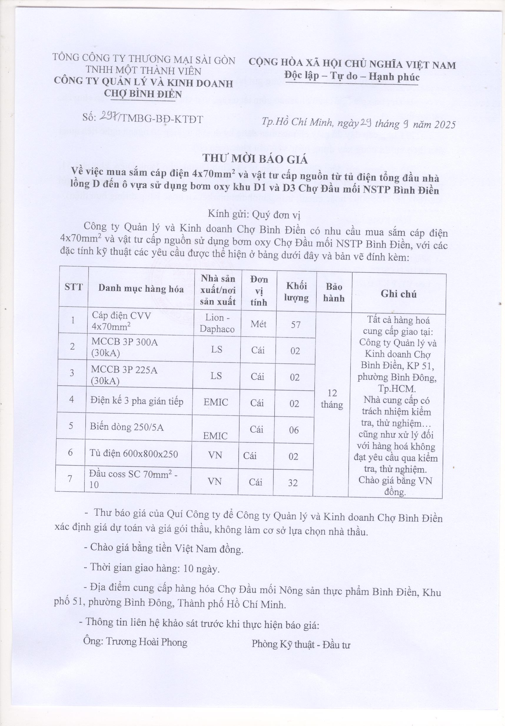 THƯ MỜI BÁO GIÁ Về việc báo giá dịch vụ Cung cấp đan thoát nước gang cầu cho nhà lồng D tại Chợ Đầu mối Nông sản Thực phẩm Bình Điền