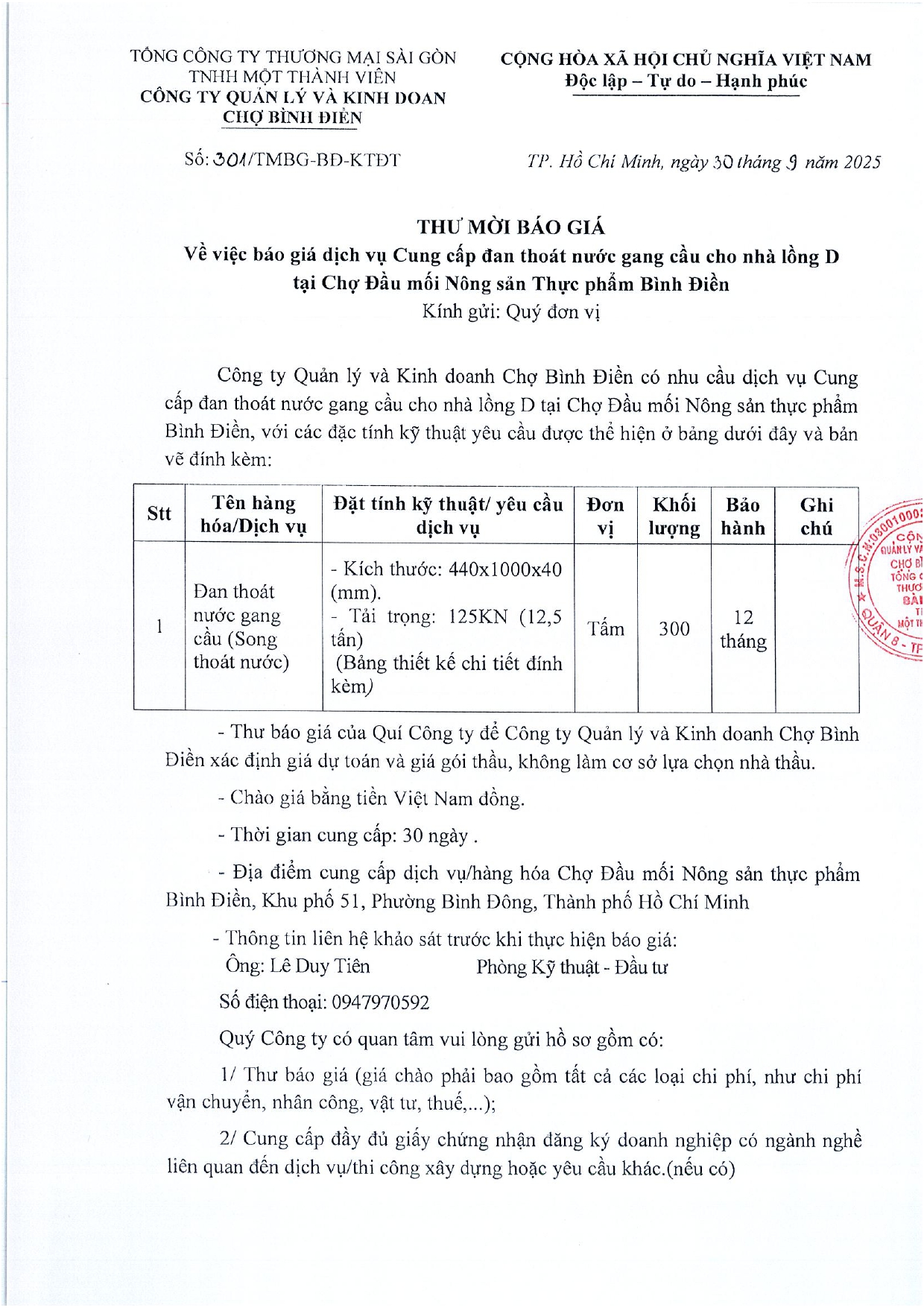 THƯ MỜI BÁO GIÁ Về việc báo giá dịch vụ Cung cấp đan thoát nước gang cầu cho nhà lồng D tại Chợ Đầu mối Nông sản Thực phẩm Bình Điền