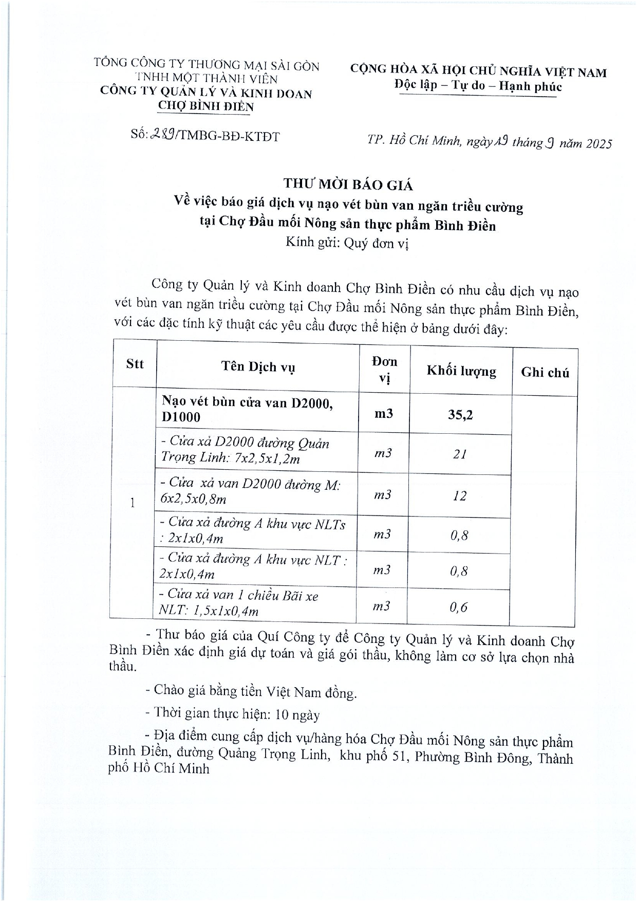 Thư mời báo giá Về việc báo giá dịch vụ nạo vét bùn van ngăn triều cường tại Chợ Đầu mối NSTP Bình Điền
