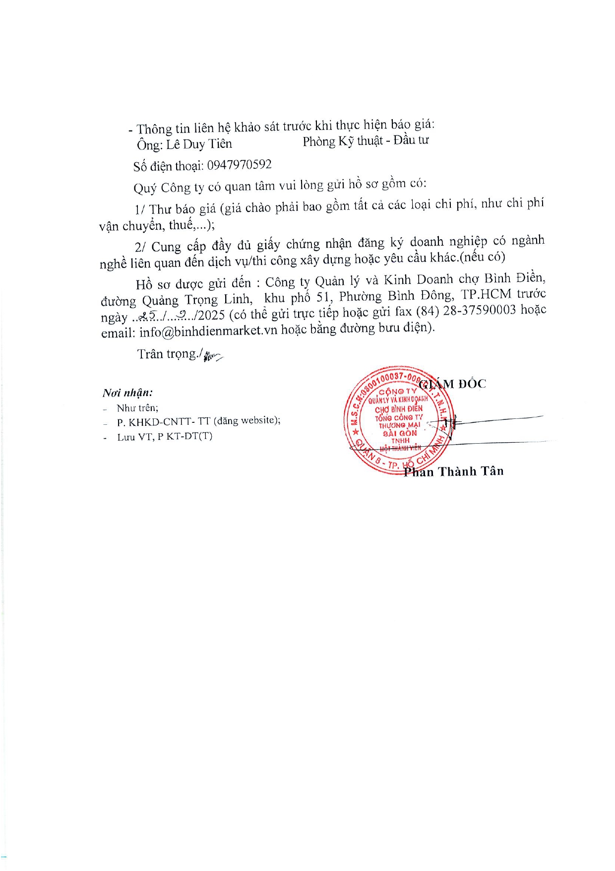 THƯ MỜI BÁO GIÁ Về việc báo giá dịch vụ Cung cấp đan thoát nước gang cầu cho nhà lồng D tại Chợ Đầu mối Nông sản Thực phẩm Bình Điền