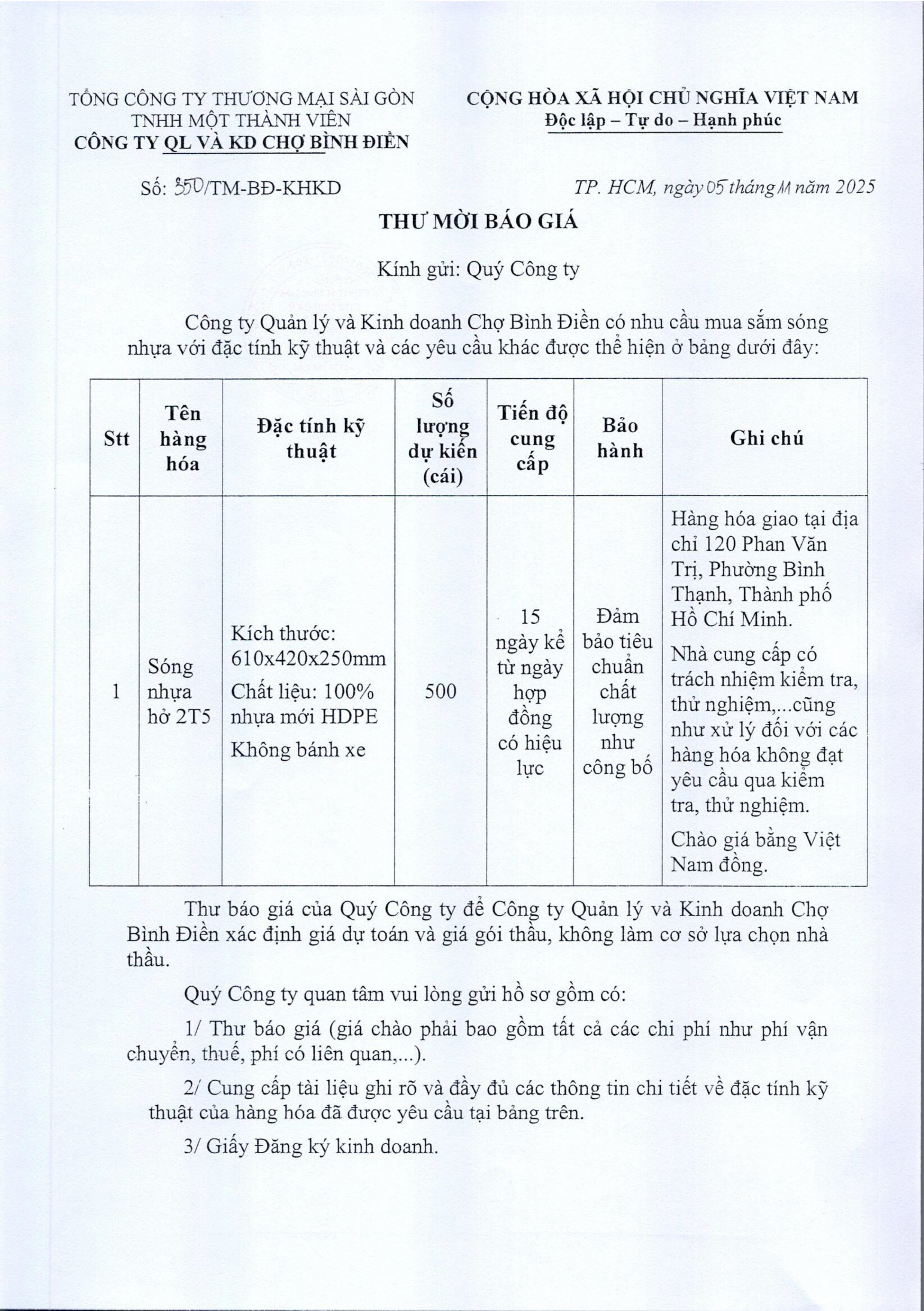 THƯ MỜI BÁO GIÁ về việc cung cấp sóng nhựa