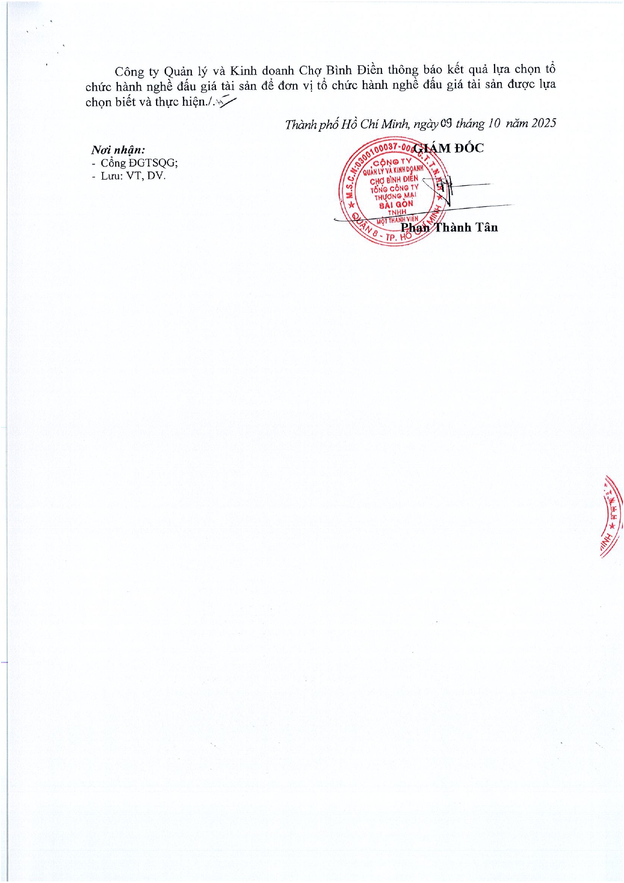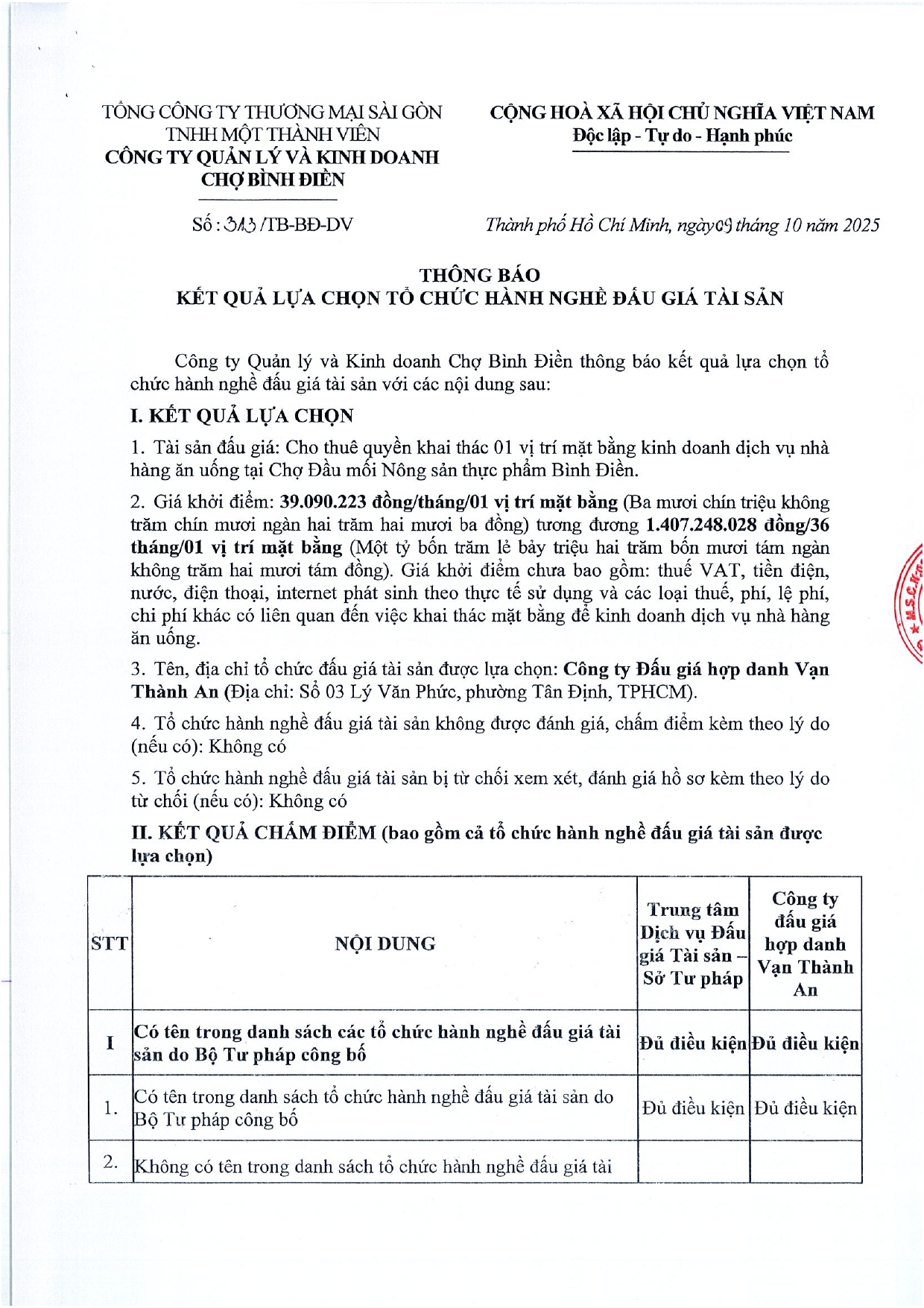 THÔNG BÁO KẾT QUẢ LỰA CHỌN TỔ CHỨC HÀNH NGHỀ ĐẤU GIÁ TÀI SẢN