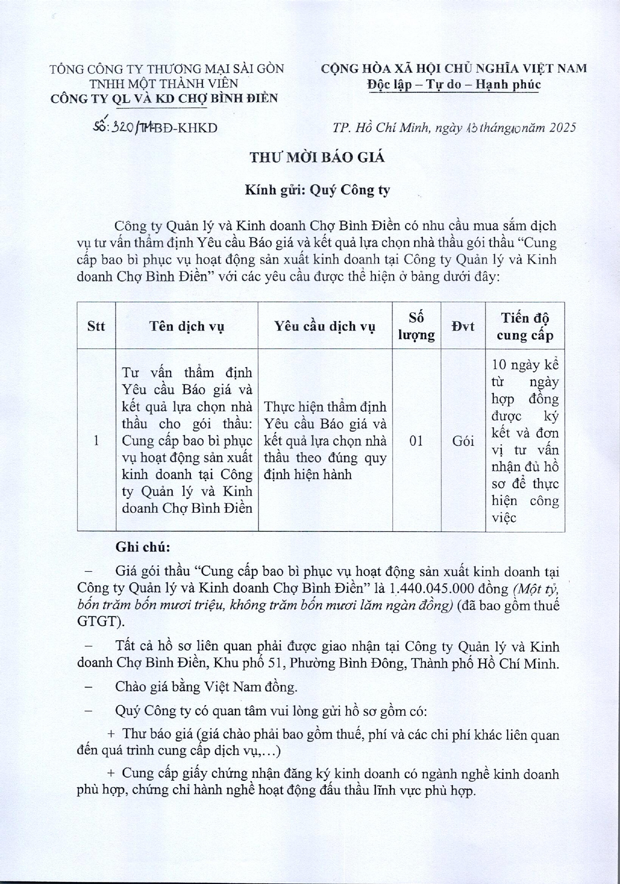 THƯ MỜI BÁO GIÁ Về việc báo giá dịch vụ Cung cấp đan thoát nước gang cầu cho nhà lồng D tại Chợ Đầu mối Nông sản Thực phẩm Bình Điền