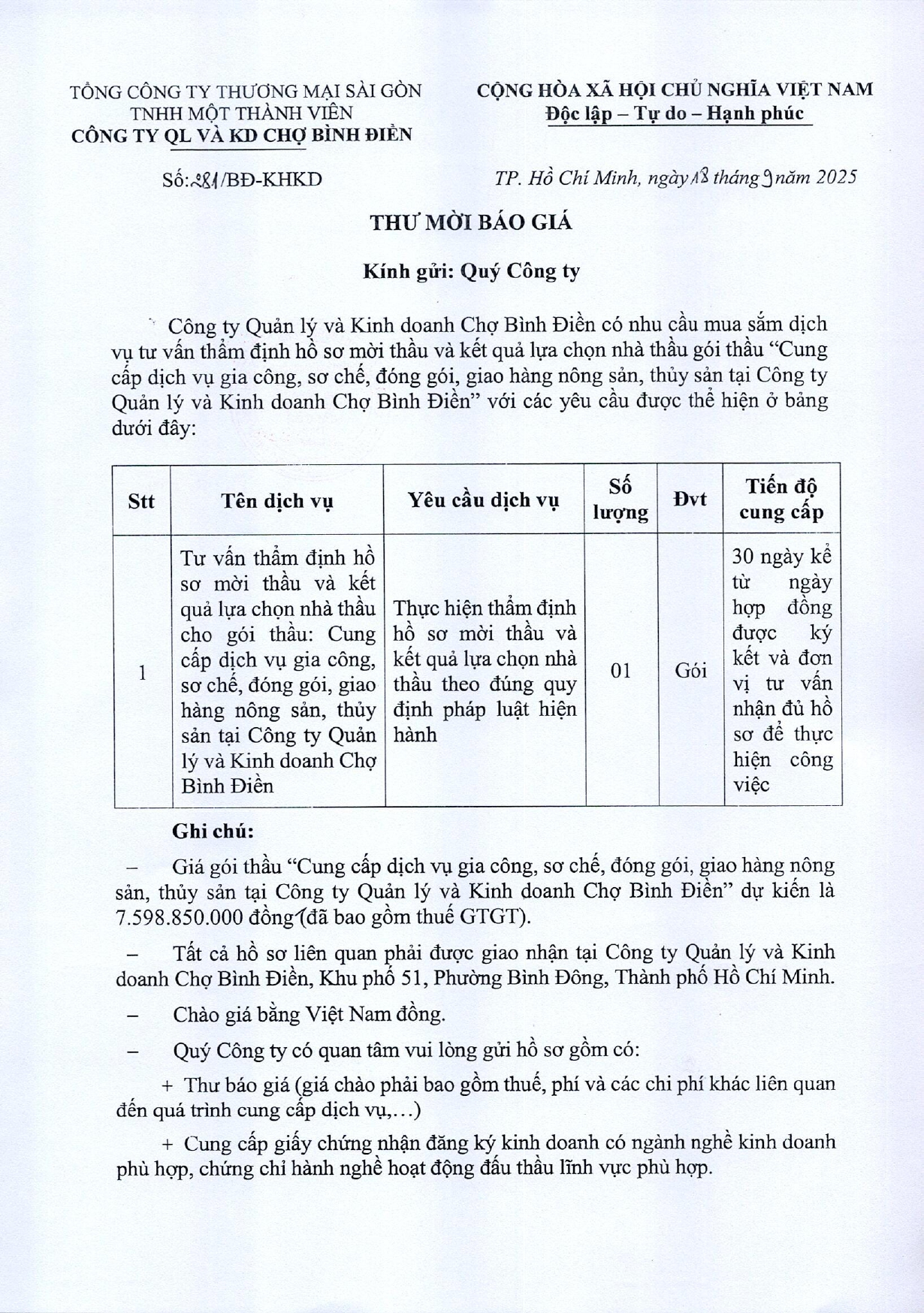 THƯ MỜI BÁO GIÁ Về việc tư vấn thẩm tra dự toán gói thầu " Cung cấp dịch vụ thu phí không dừng tại Trạm thu phí Chợ đầu mối NSTP Bình ĐIền "