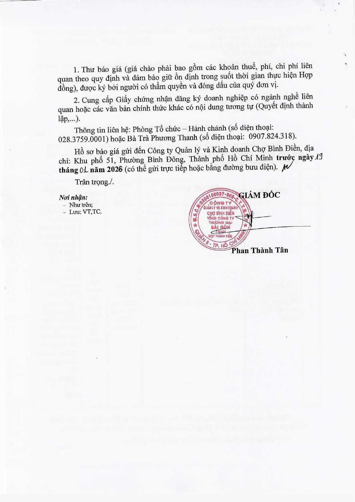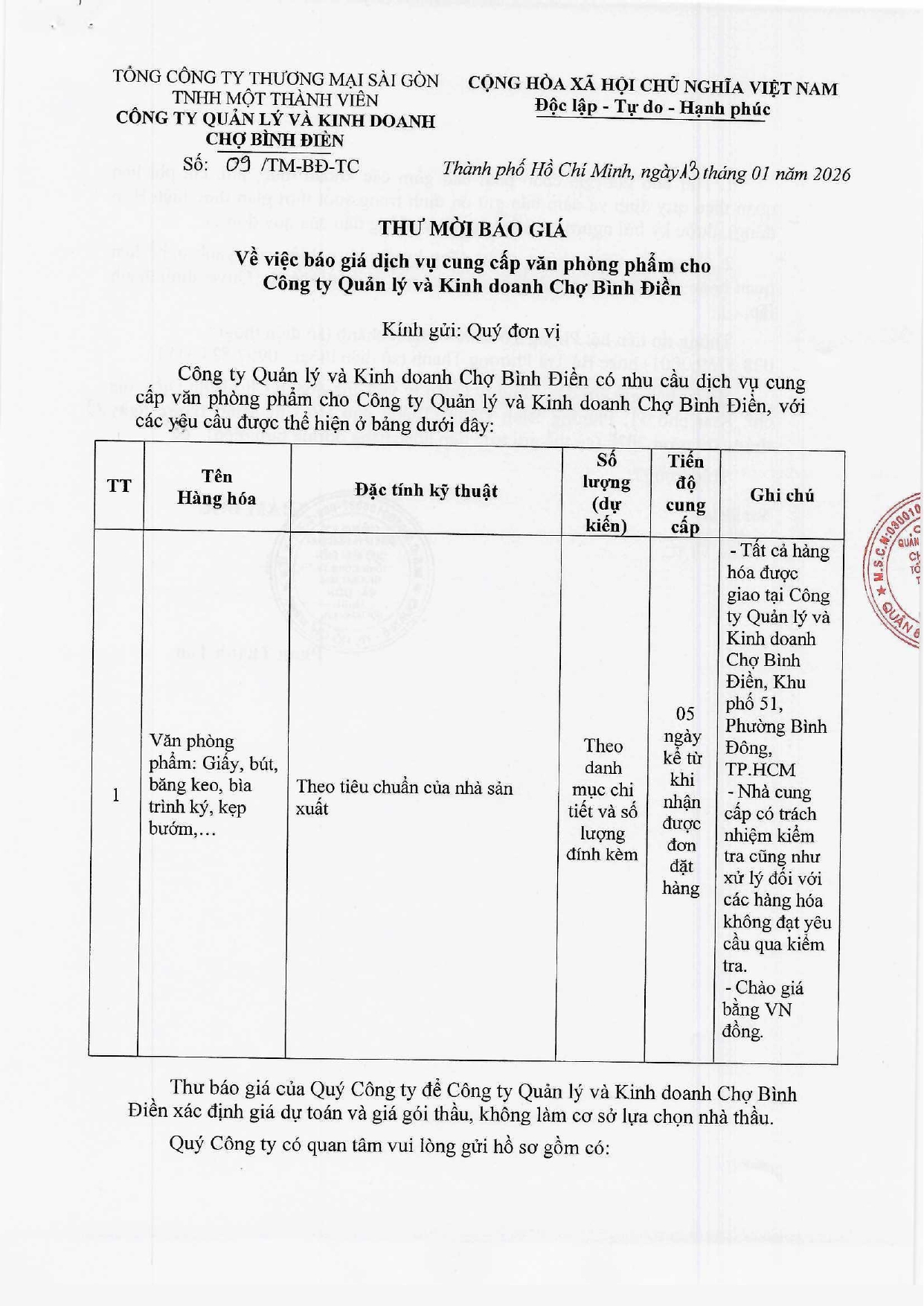 THƯ MỜI BÁO GIÁ Về việc báo giá dịch vụ cung cấp văn phòng phẩm cho Công ty Quản lý và Kinh doanh Chợ Bình Điền
