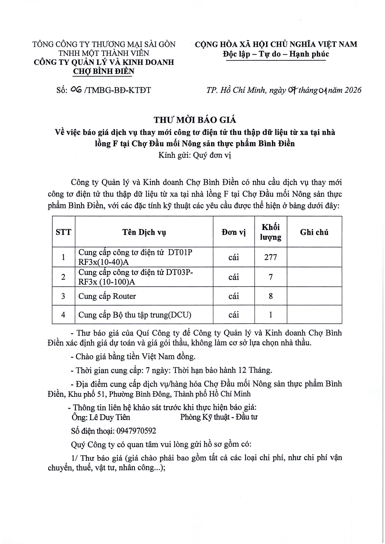 THƯ MỜI BÁO GIÁ Về việc báo giá dịch vụ thay mới công tơ điện tử thu nhập dữ liệu từ xa tại nhà lồng F tại Chợ Đầu mối NSTP Bình Điền