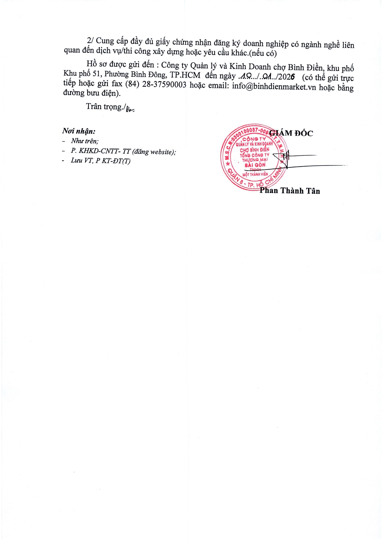 THƯ MỜI BÁO GIÁ Về việc báo giá cung ứng vật tư lắp nguồn điện chiếu sáng 5 biển quảng cáo tại Chợ Đầu mối Nông sản thực phẩm Bình Điền