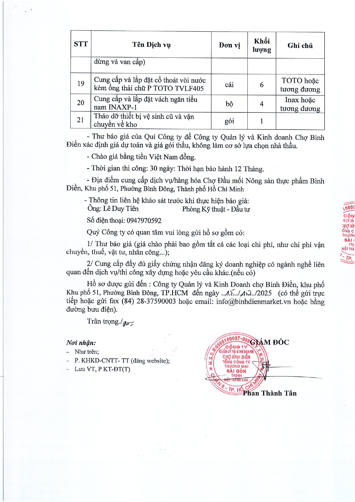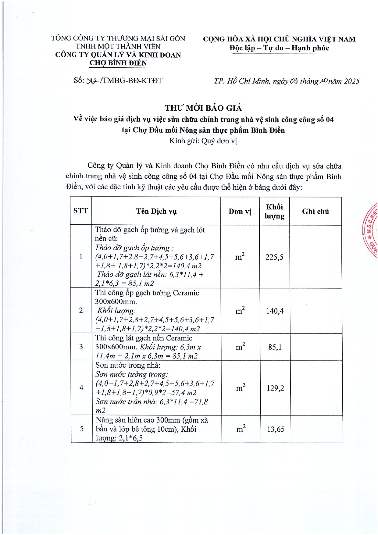 THƯ MỜI BÁO GIÁ Về việc báo giá dịch vụ việc sửa chữa chỉnh trang nhà vệ sinh công cộng số số 04 tại Chợ Đầu mối Nông sản thực phẩm Bình Điền