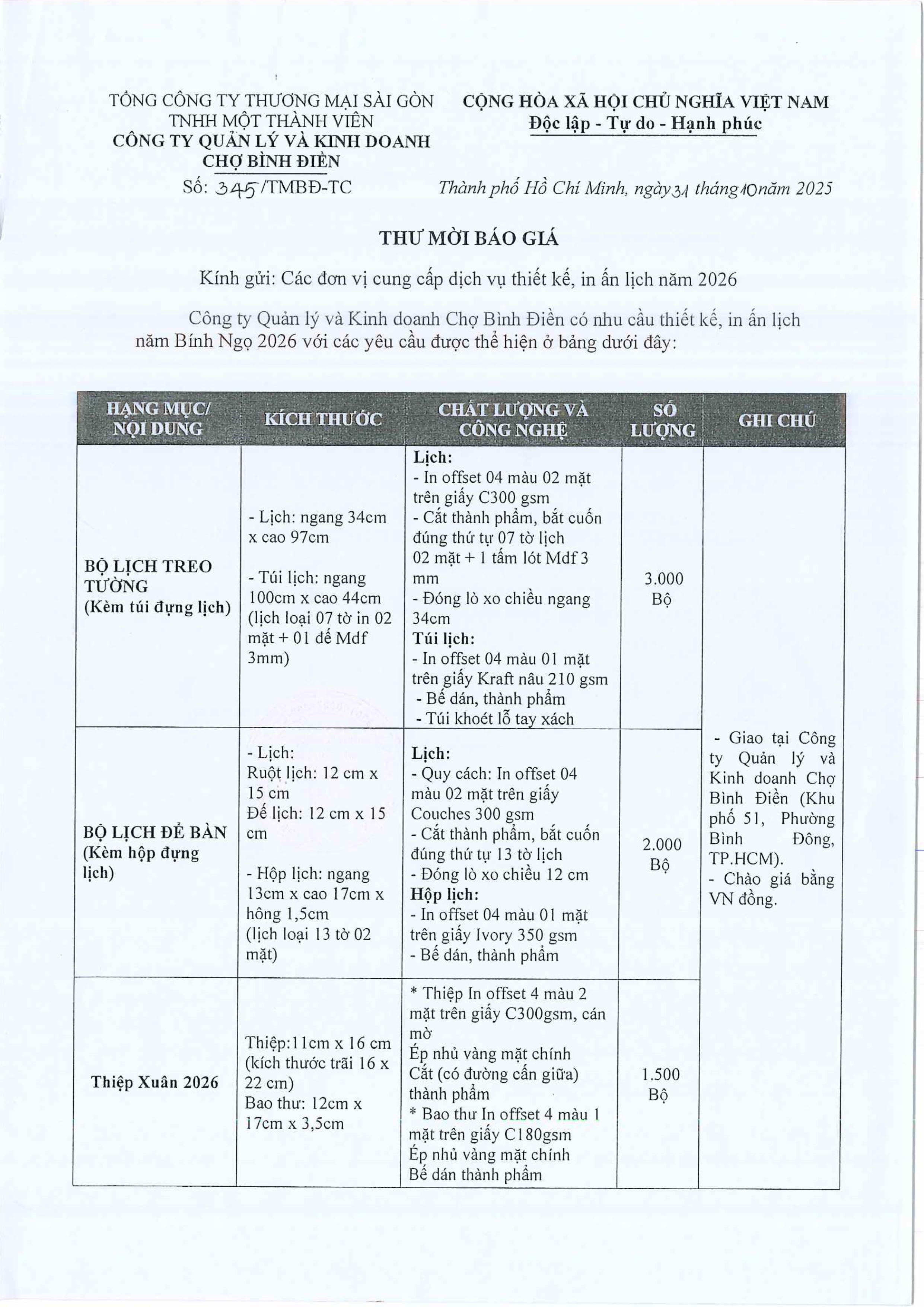 THƯ MỜI BÁO GIÁ về việc cung cấp dịch vụ thiết kế, in ấn lịch năm 2026