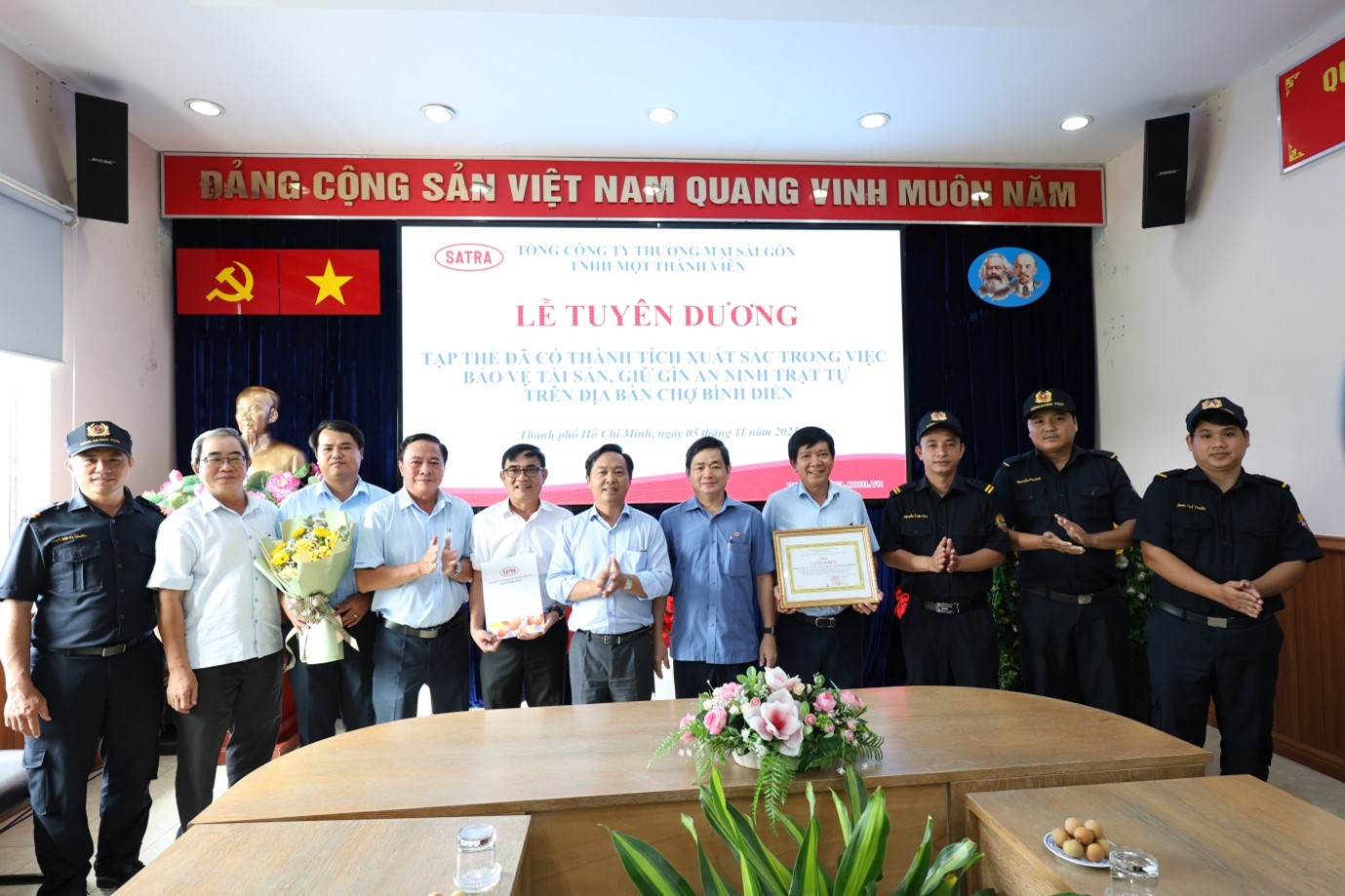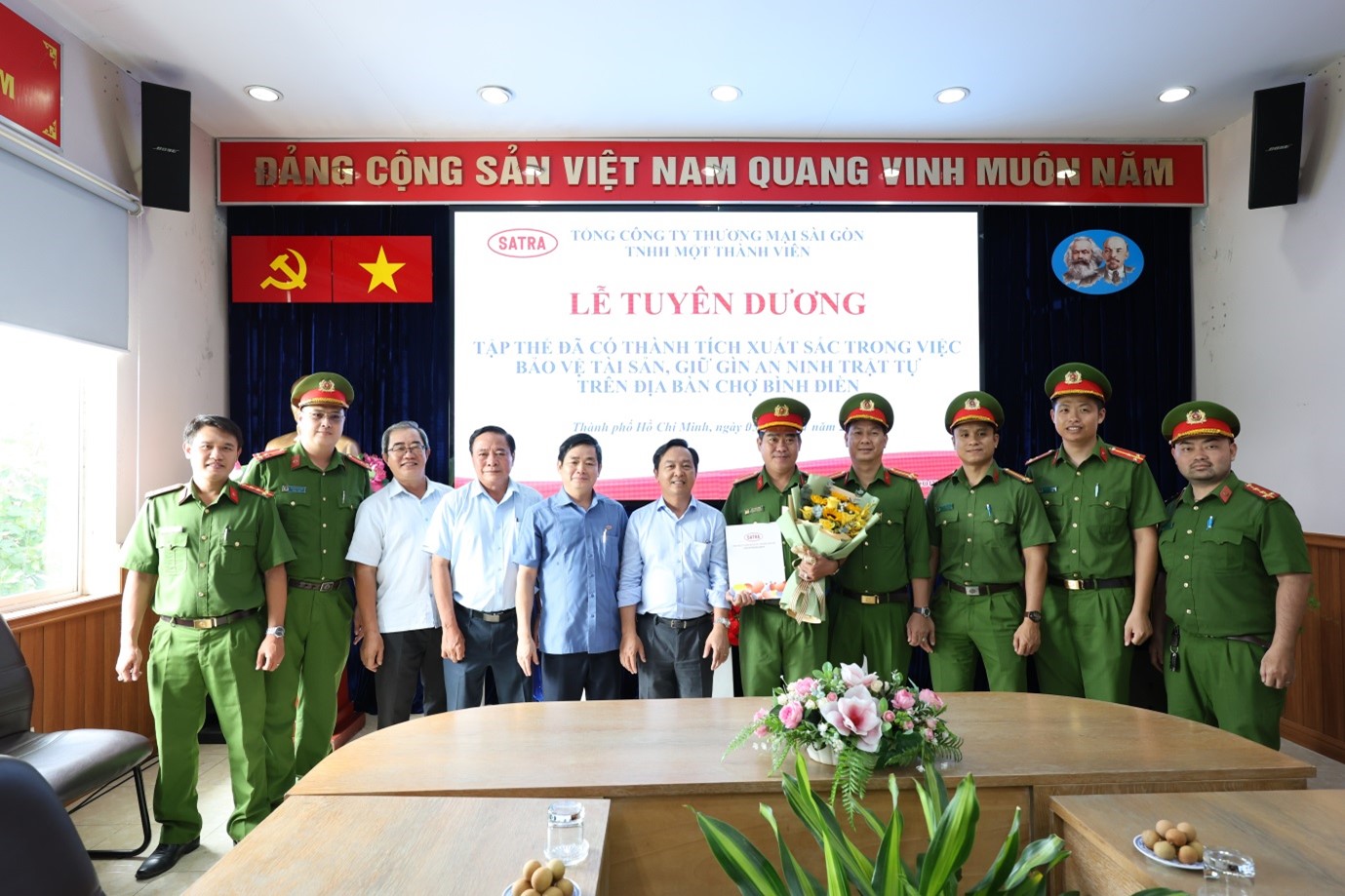 Ngày 05/11/2025, Tổng Công ty Thương mại Sài Gòn – TNHH MTV (SATRA) đã tổ chức tuyên dương, khen thưởng đột xuất tập thể Công an phường Bình Đông, TP. Hồ Chí Minh và Phòng An ninh – Phòng cháy chữa cháy (AN – PCCC) Công ty Quản lý và Kinh doanh Chợ Bình Điền có thành tích xuất sắc trong phối hợp truy bắt nhanh đối tượng cướp tài sản của thương nhân tại Chợ Đầu mối Nông  sản thực phẩm Bình Điền.