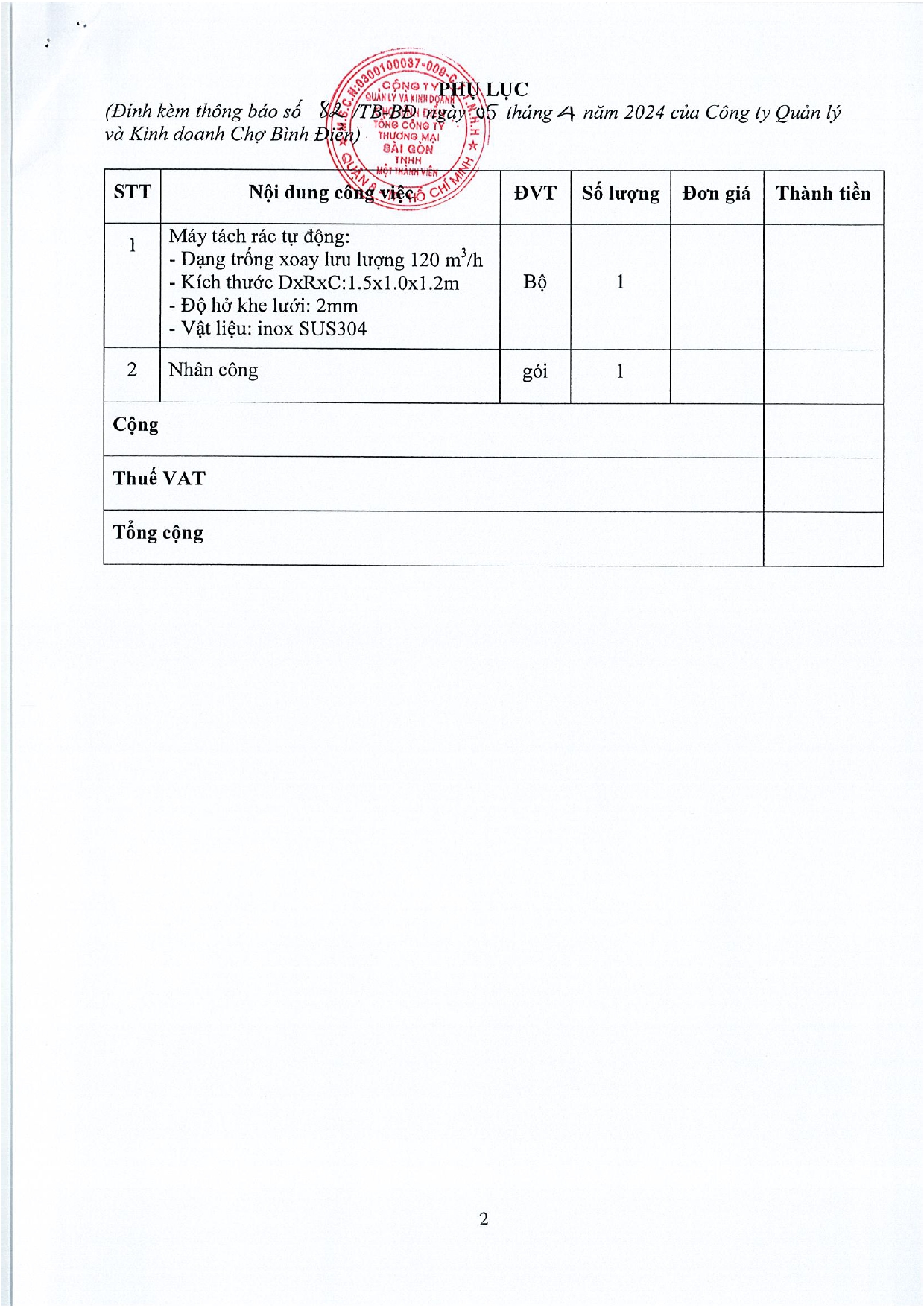 Thông Báo Về việc chào giá dịch vụ thay thế máy tách rác cho nhà máy xử lý nước thải tại chợ đầu mối Bình Điền