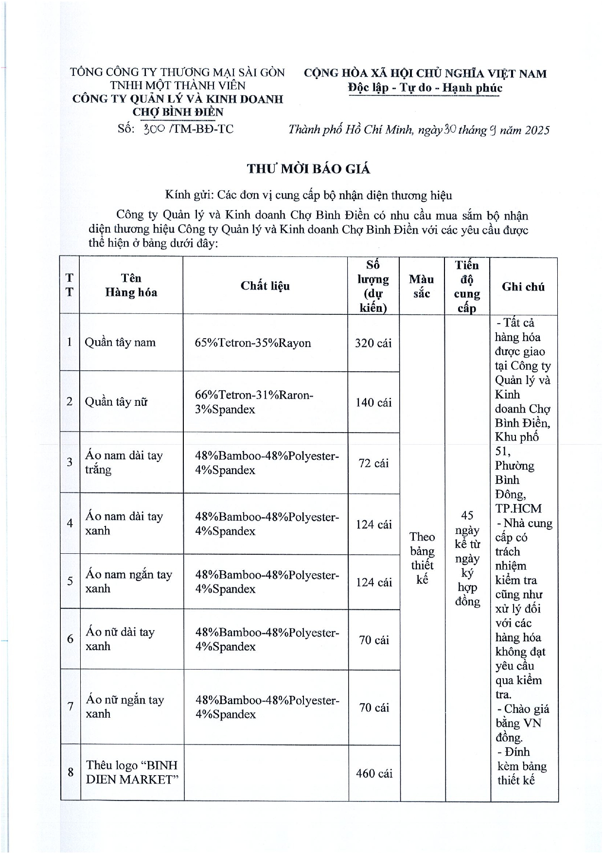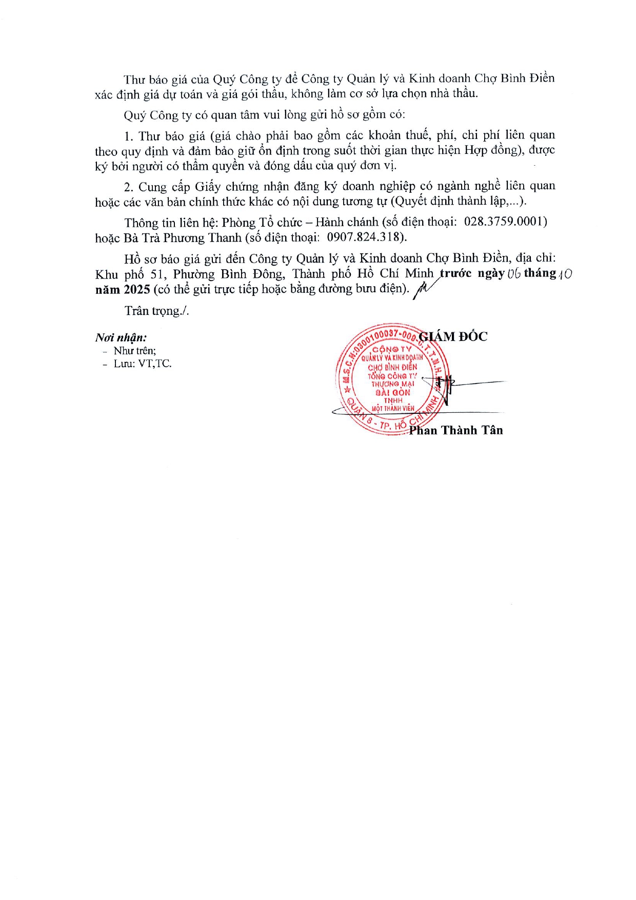 THƯ MỜI BÁO GIÁ Về việc báo giá dịch vụ Cung cấp đan thoát nước gang cầu cho nhà lồng D tại Chợ Đầu mối Nông sản Thực phẩm Bình Điền
