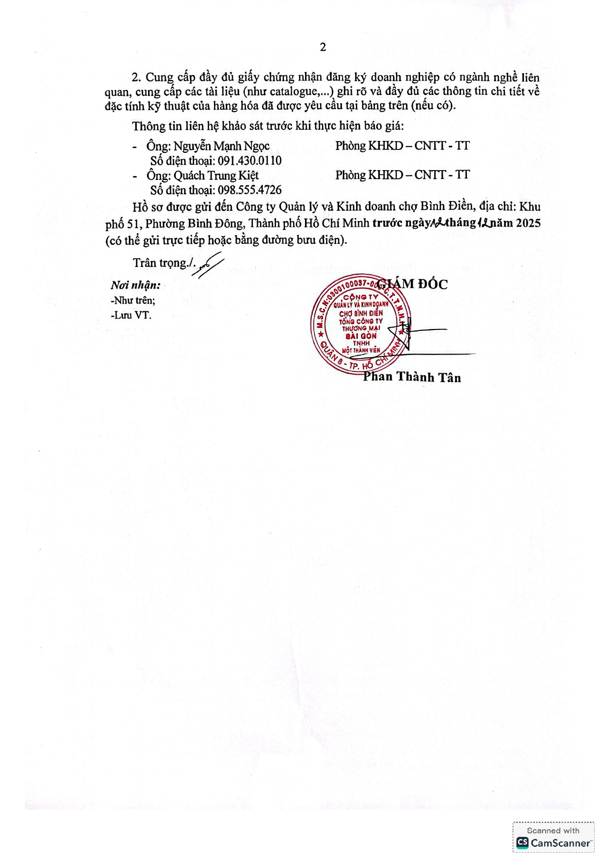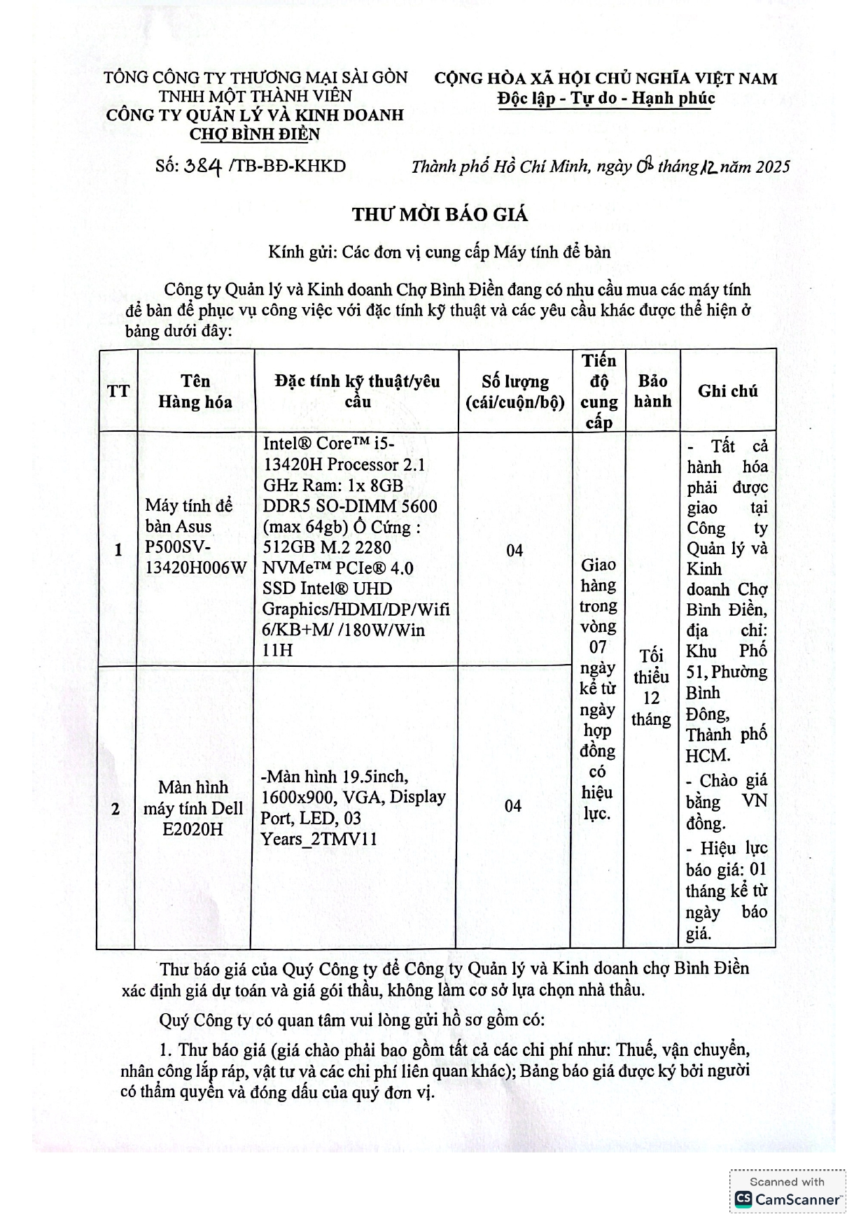 THƯ MỜI BÁO GIÁ Về việc cung cấp dịch vụ vệ sinh công nhật hằng ngày tại Công ty Chợ Bình Điền