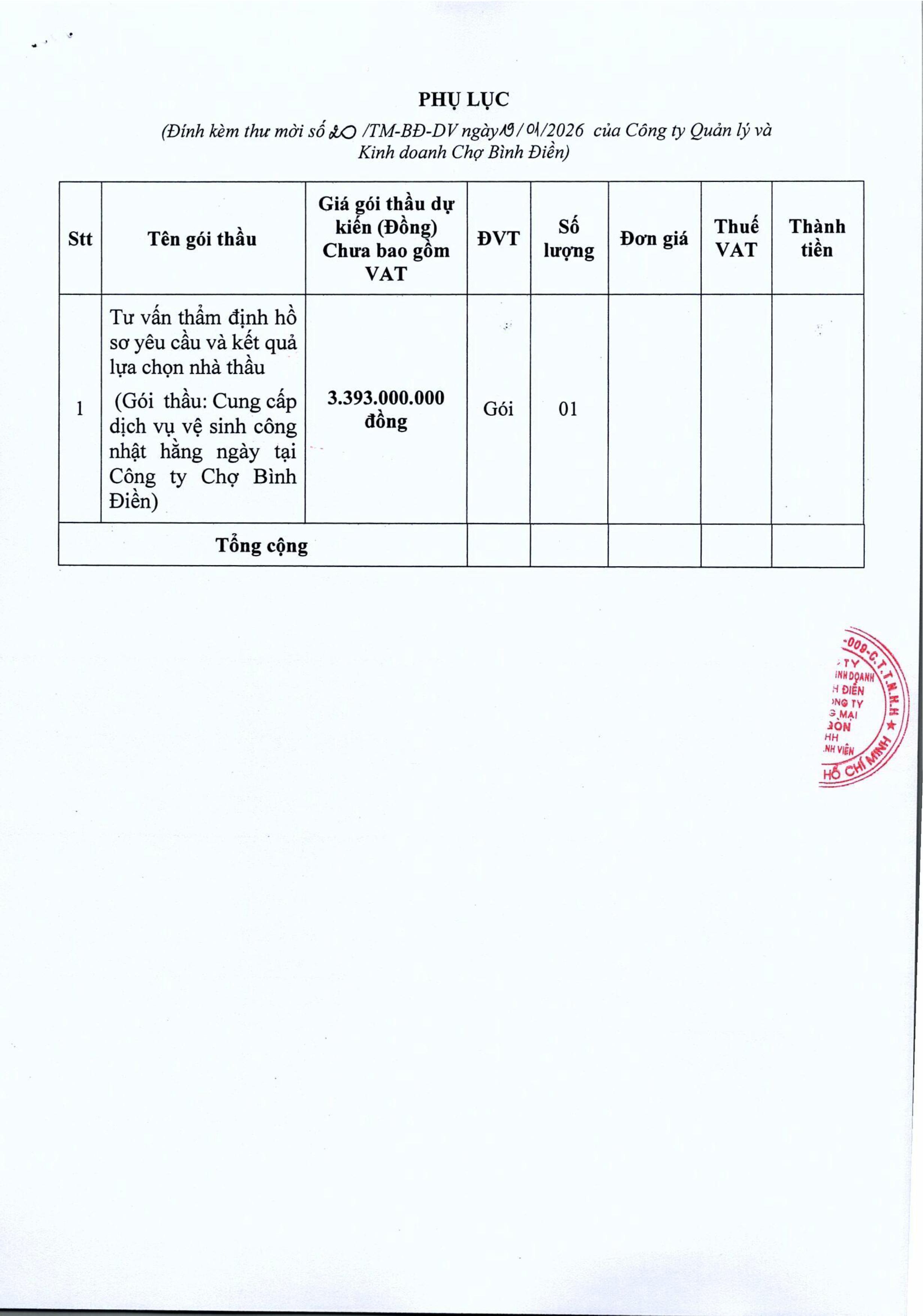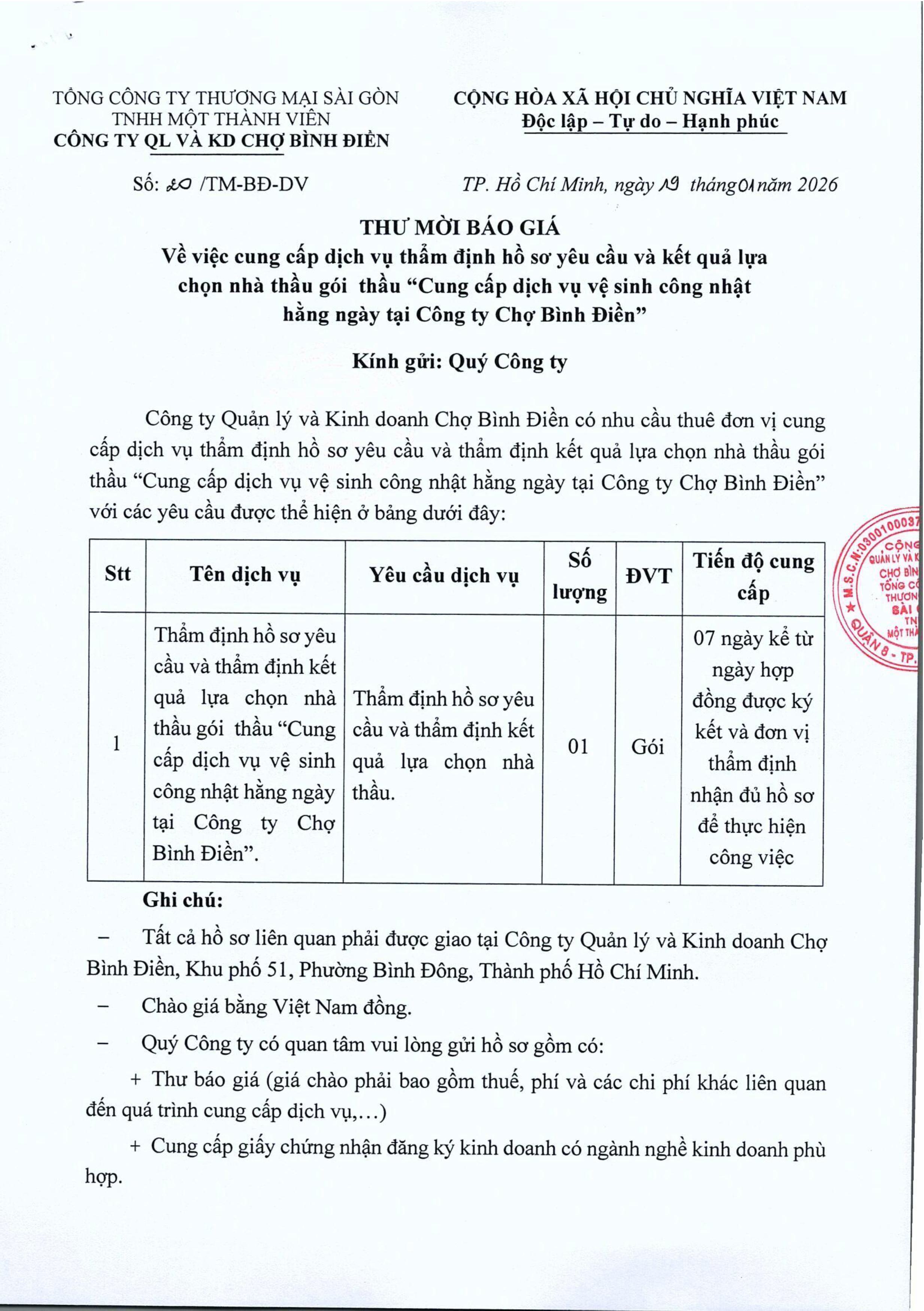 THƯ MỜI BÁO GIÁ về việc cung cấp dịch vụ thẩm định hồ sơ yêu cầu và kết quả lựa chọn nhà thầu gói thầu "Cung cấp dịch vụ vệ sinh công nhật hằng ngày tại Công ty Chợ Bình Điền"