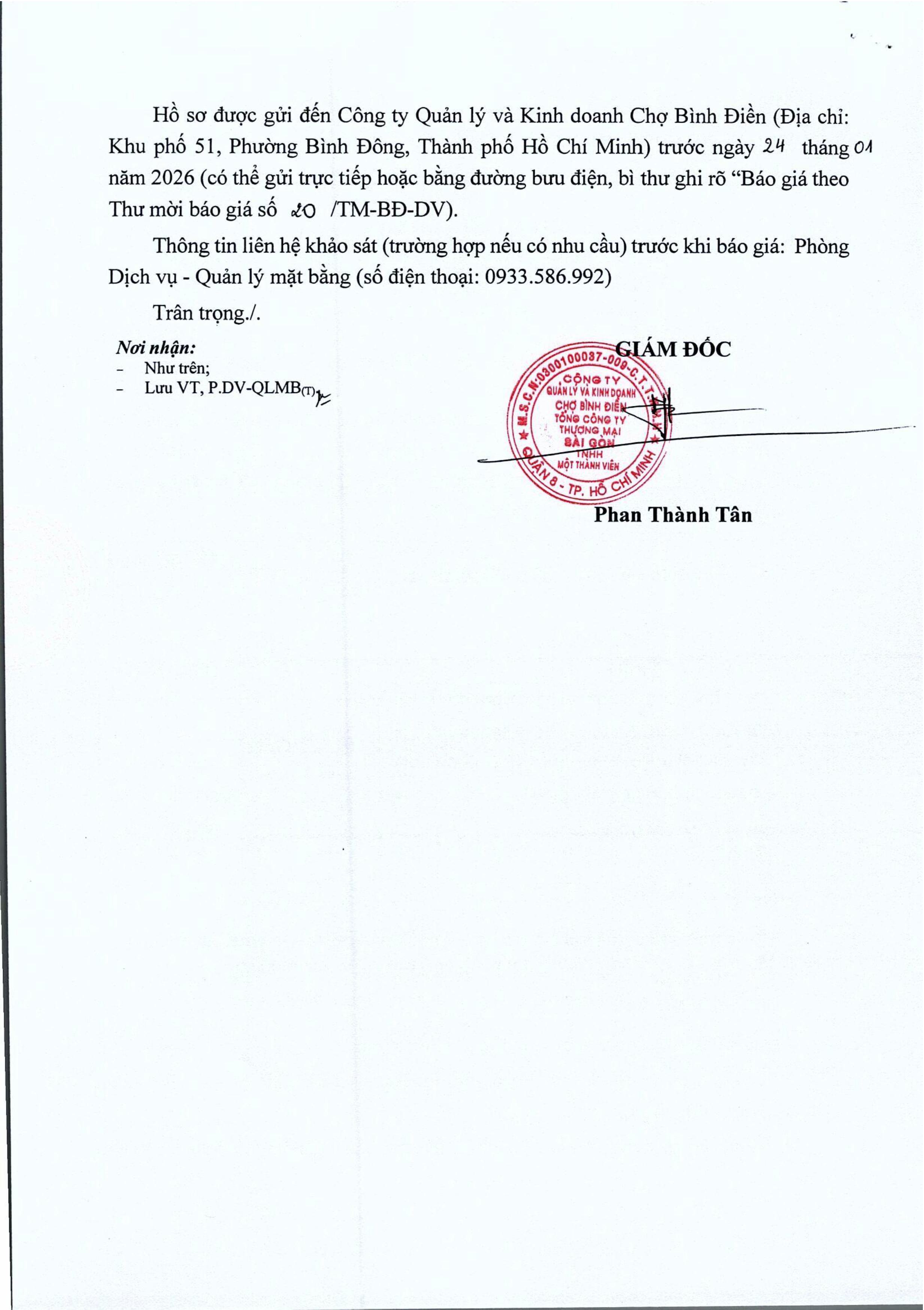 THƯ MỜI BÁO GIÁ Về việc báo giá dịch vụ cung cấp văn phòng phẩm cho Công ty Quản lý và Kinh doanh Chợ Bình Điền