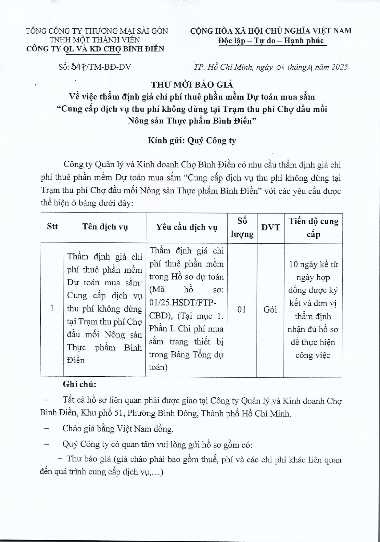 THƯ MỜI BÁO GIÁ Về việc thẩm định giá chi phí thuê phần mềm gói thầu " Cung cấp dịch vụ thu phí không dừng tại Trạm thu phí Chợ Đầu mối NSTP Bình Điền"