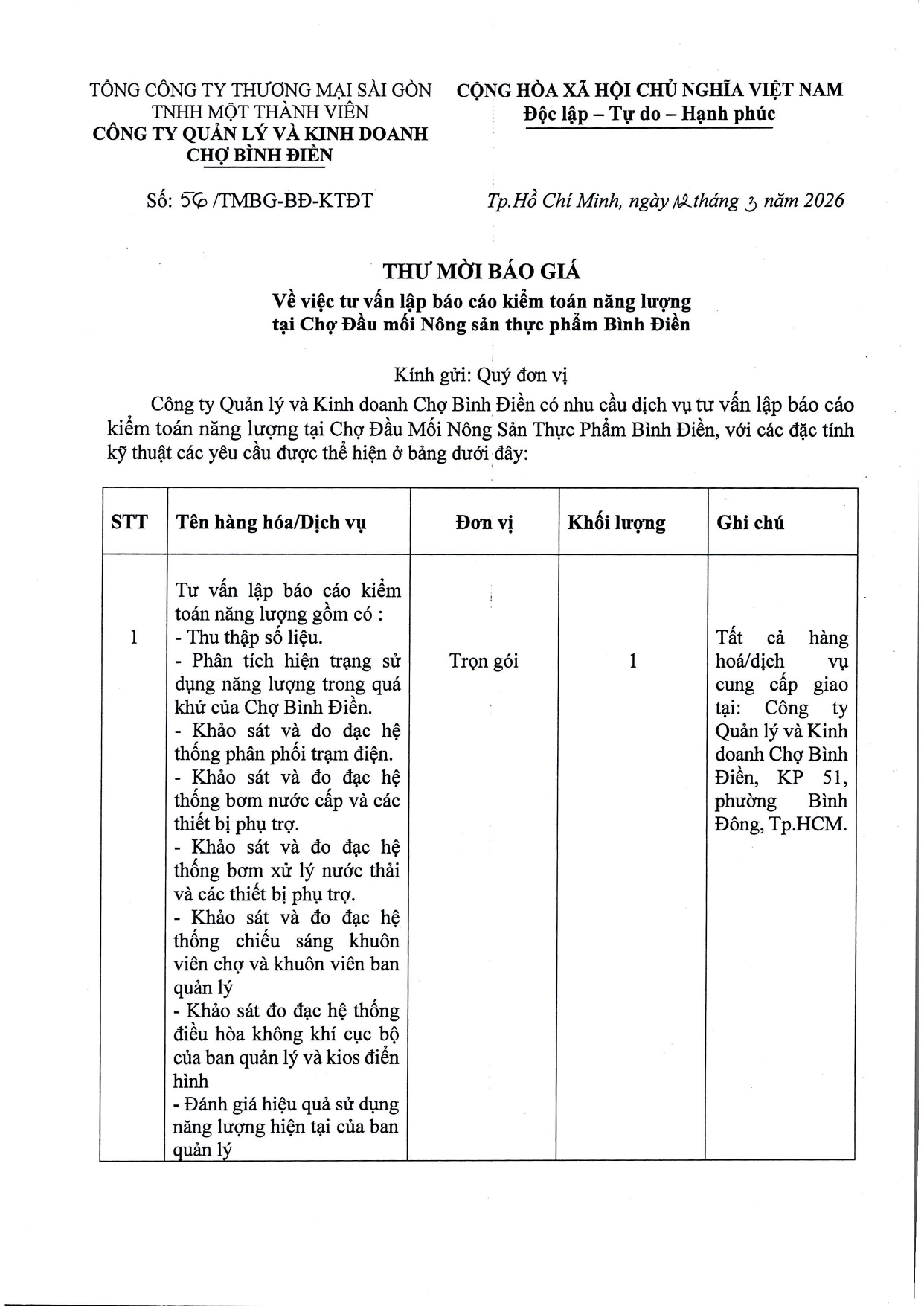 THƯ MỜI BÁO GIÁ Về việc tư lập báo cáo kiểm toán năng lượng tại Chợ Đầu mối NSTP Bình Điền
