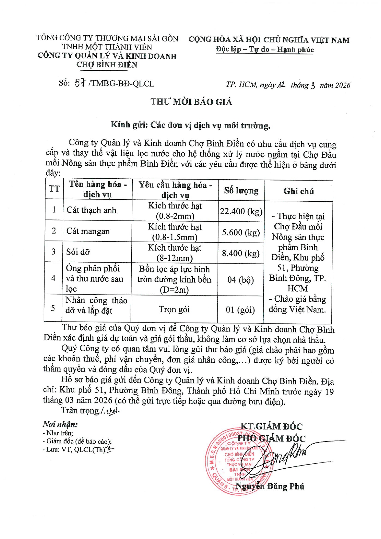 THƯ MỜI BÁO GIÁ về việc báo giá thay mới hệ thống đèn chữ, đèn led tại Trạm thu phí tại Chợ đầu mối nông sản thực phẩm Bình Điền
