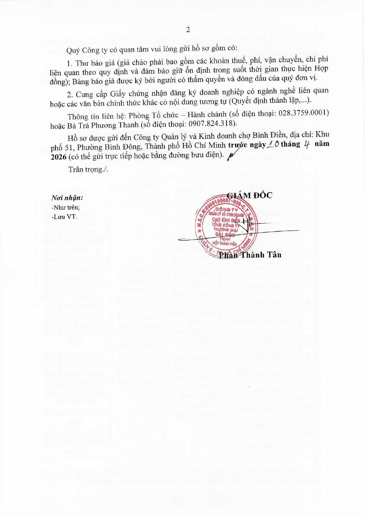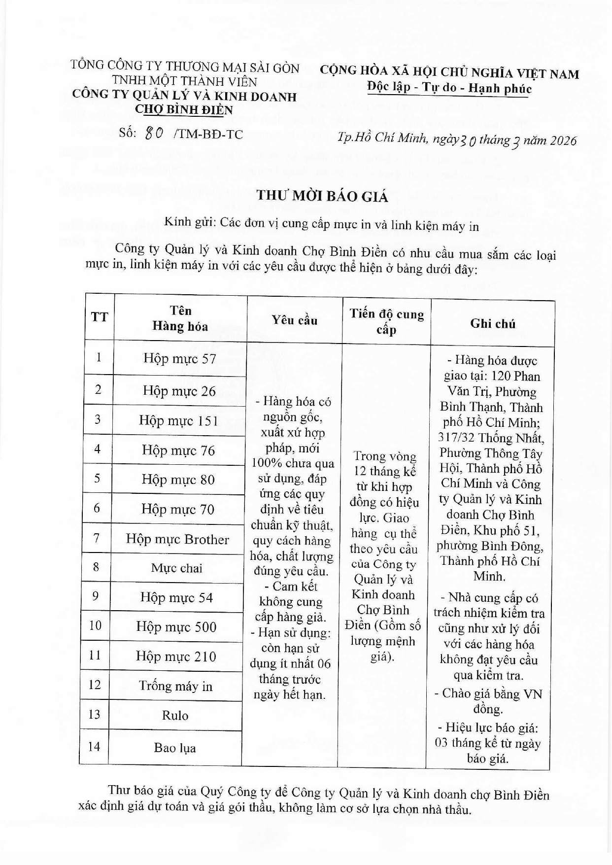 THƯ MỜI BÁO GIÁ Về việc báo giá vật tư cấp nguồn điện cho 25 điểm Công Đoàn tại Chợ Đầu mối NSTP Bình Điền