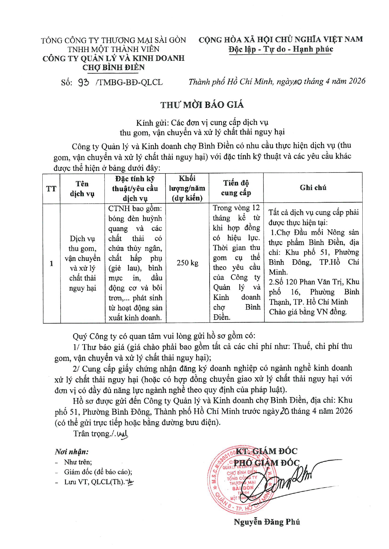 THƯ MỜI BÁO GIÁ Về việc báo giá dịch vụ sửa chữa tạm một phần nền sàn nhà lồng K tại Chợ Đầu mối NSTP Bình Điền
