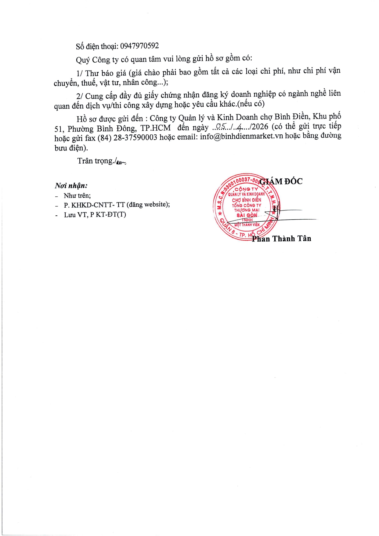 THƯ MỜI BÁO GIÁ Về việc báo giá vật tư cấp nguồn điện cho 25 điểm Công Đoàn tại Chợ Đầu mối NSTP Bình Điền