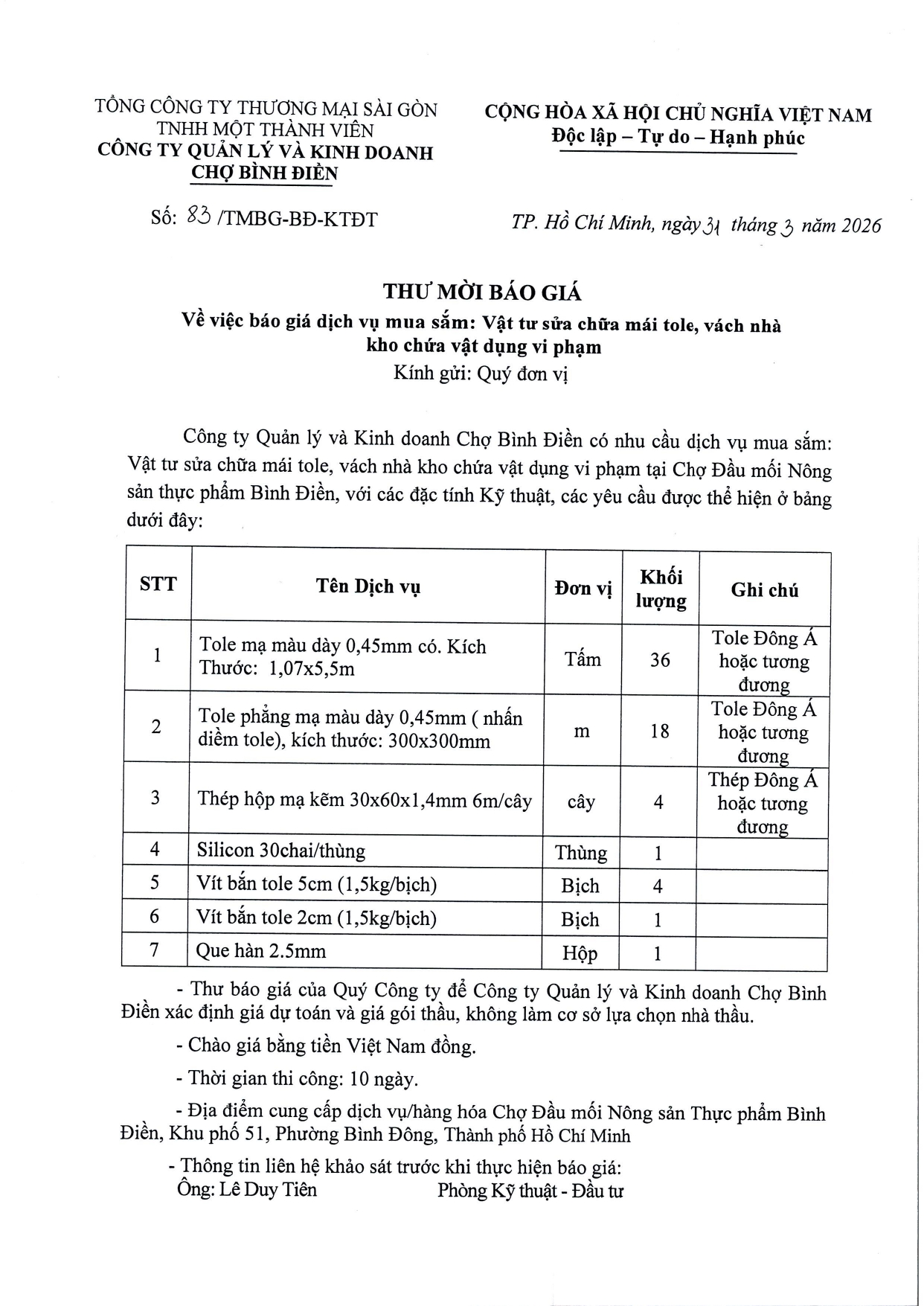 THƯ MỜI BÁO GIÁ về việc báo giá dịch vụ mua sắm: Vật tư sửa chữa mái tole căn tin Chợ Bình Điền