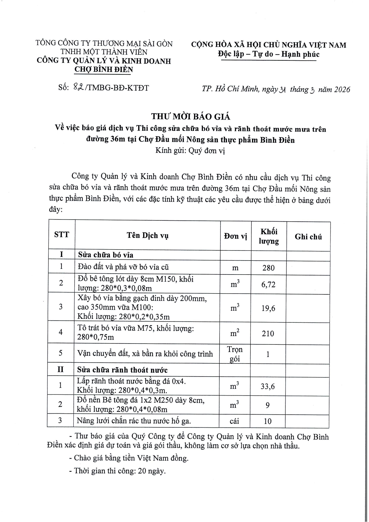 THƯ MỜI BÁO GIÁ Về việc báo giá dịch vụ Thi công sửa chữa bó vỉa và rảnh thoát nước mưa trên đường 36m tại Chợ Đầu mối NSTP Bình Điền