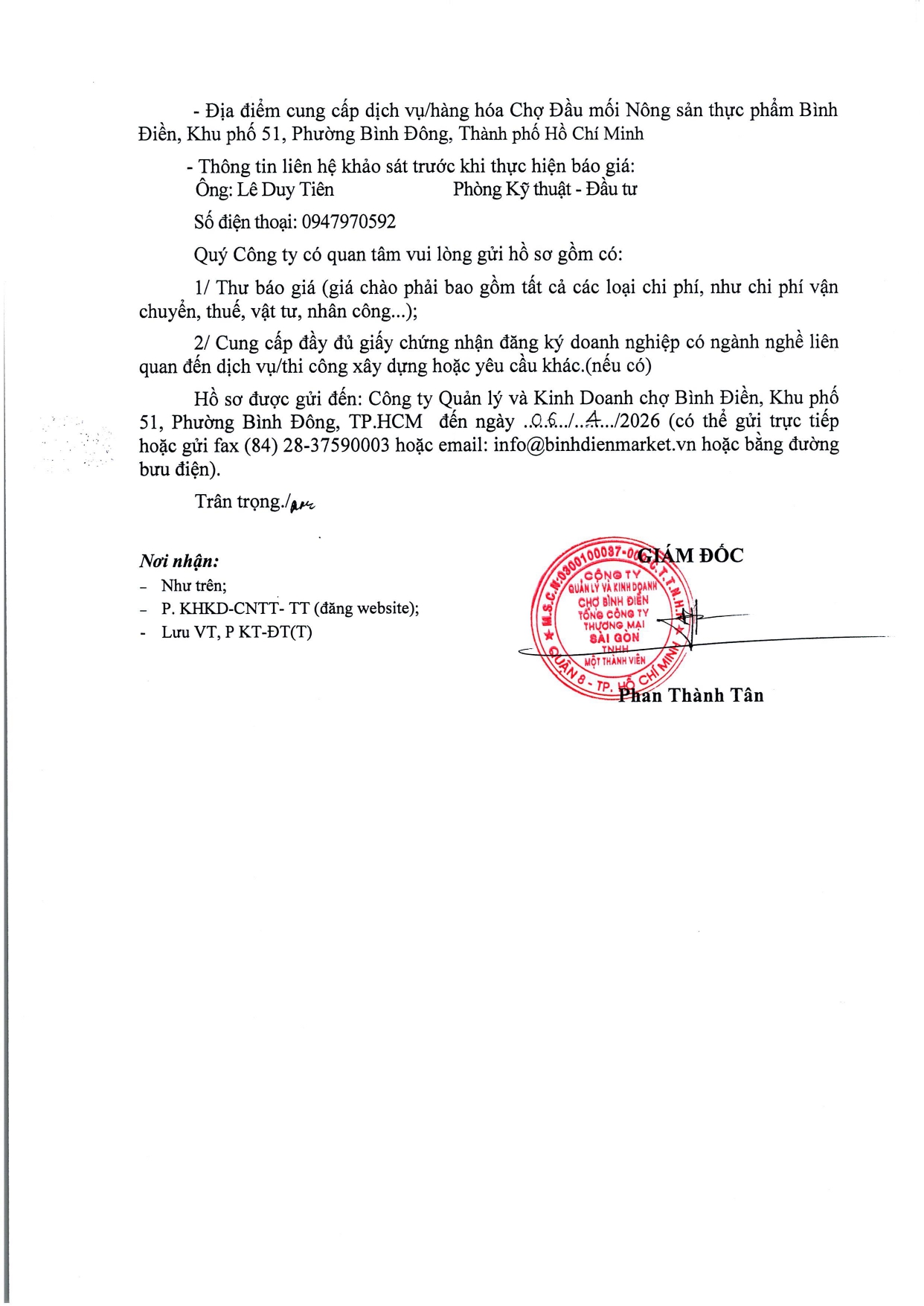 THƯ MỜI BÁO GIÁ Về việc báo giá vật tư cấp nguồn điện cho 25 điểm Công Đoàn tại Chợ Đầu mối NSTP Bình Điền