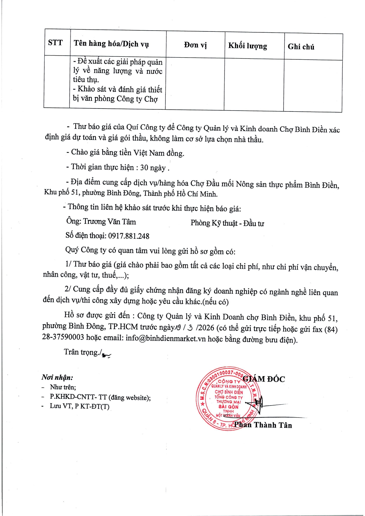 THƯ MỜI BÁO GIÁ Về việc tư lập báo cáo kiểm toán năng lượng tại Chợ Đầu mối NSTP Bình Điền